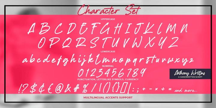 Anthony Writters is Font Authentic that is written casually and quickly. Then scanned and carefully drawn into vector format.